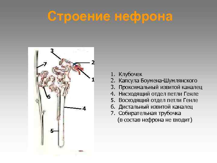 Строение нефрона 3 7 2 1. Клубочек 1 2. Капсула Боумена-Шумлянского 3. Проксимальный извитой каналец 4. Нисходящий отдел петли Генле 6 5. Восходящий отдел петли Генле 4 6. Дистальный извитой каналец 7. Собирательная трубочка (в состав нефрона не входит) 5