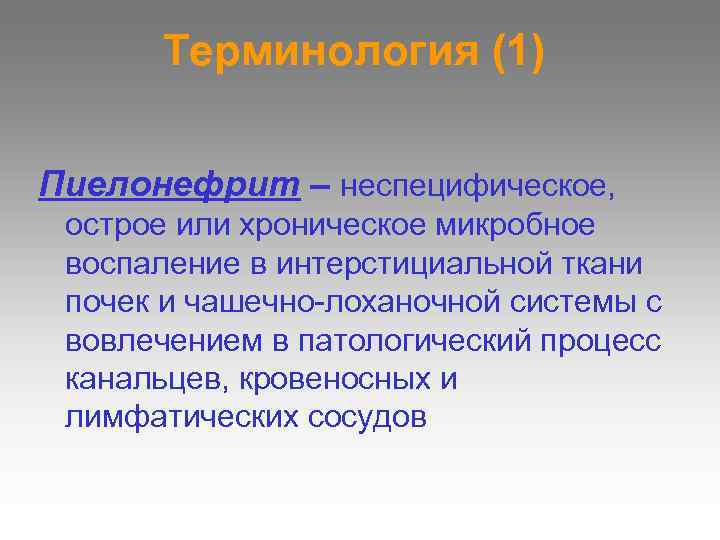 Терминология (1) Пиелонефрит – неспецифическое, острое или хроническое микробное воспаление в интерстициальной ткани почек и чашечно-лоханочной системы с вовлечением в патологический процесс канальцев, кровеносных и лимфатических сосудов