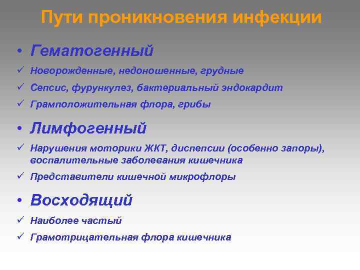Пути проникновения инфекции • Гематогенный ü Новорожденные, недоношенные, грудные ü Сепсис, фурункулез, бактериальный эндокардит ü Грамположительная флора, грибы • Лимфогенный ü Нарушения моторики ЖКТ, диспепсии (особенно запоры), воспалительные заболевания кишечника ü Представители кишечной микрофлоры • Восходящий ü Наиболее частый ü Грамотрицательная флора кишечника
