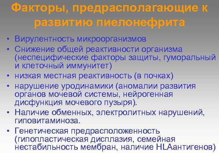 Факторы, предрасполагающие к развитию пиелонефрита • Вирулентность микроорганизмов • Снижение общей реактивности организма (неспецифические факторы защиты, гуморальный и клеточный иммунитет) • низкая местная реактивность (в почках) • нарушение уродинамики (аномалии развития органов мочевой системы, нейрогенная дисфункция мочевого пузыря). • Наличие обменных, электролитных нарушений, гиповитаминоза. • Генетическая предрасположенность (гипопластическая дисплазия, семейная нестабильность мембран, наличие HLAантигенов)