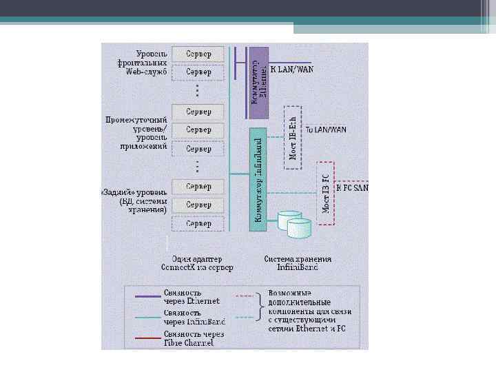 Fibre channel Fibre Channel (FC) – технологический стандарт, позволяющий осуществлять высокоскоростную передачу данных (до 16 Гбит/с). Эта технология является преобладающей технологией сетей хранения данных (SAN) , где FC используется как стандартный способ подключения к системам хранения данных уровня предприятия. FC стандартизирована комитетом T 11 INCITS ANSI Среда передачи: преимущественно оптоволокно Виды технологии: 1 GFC, 2 GFC, 4 GFC, 8 GFC, 10 GFC, 16 GFC в зависимости от скорости Кодирование: NRZI 8 b/10 b (для 1/2/4/8 GFC) или 64 b/66 b (для 10/16 GFC) Топологии FC: Точка-точка (point-to-point) (FC-P 2 P) Управляемая петля (arbitrated loop) (FC-AL) Фабрика коммутаторов (switch fabric) (FC-SW)