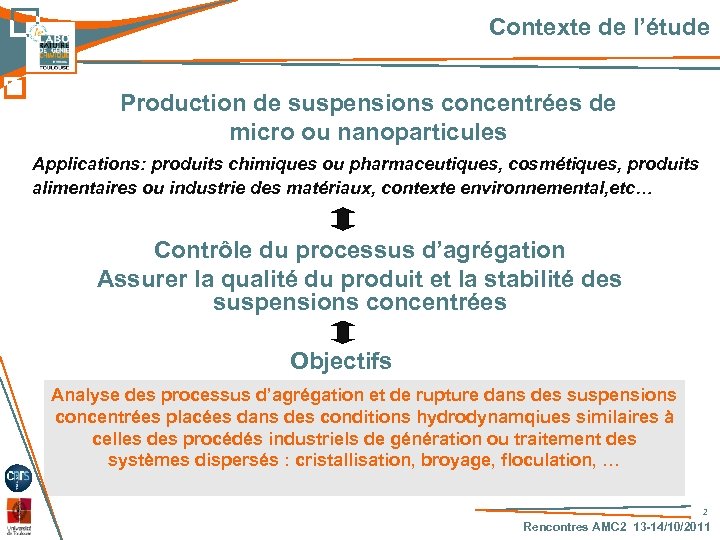 Contexte de l’étude Production de suspensions concentrées de micro ou nanoparticules Applications: produits chimiques ou pharmaceutiques, cosmétiques, produits alimentaires ou industrie des matériaux, contexte environnemental, etc… Contrôle du processus d’agrégation Assurer la qualité du produit et la stabilité des suspensions concentrées Objectifs Analyse des processus d’agrégation et de rupture dans des suspensions concentrées placées dans des conditions hydrodynamqiues similaires à celles des procédés industriels de génération ou traitement des systèmes dispersés : cristallisation, broyage, floculation, … 2 Rencontres AMC 2 13 -14/10/2011