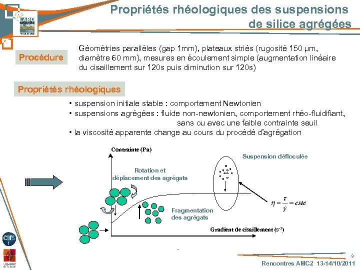 Mécanismes d’agrégation de la silice Agrégation Péricinétique Première étape lente – le déplacement des particules prinaires est induit par mouvement Brownien agitation Pendant la deuxième étape, les mouvements des particules résultent des mouvements du fluide (agitation) 100 nm 1 µm diffusion Fréquence de collision entre une particule de diamètre 100 nm et une particule de diamètre compris entre 10 nm et 10 µ Agrégation Orthocinétique Les agrégats sont formés par adhésion de petits agrégats, les collisons résultent des mouvements du fluide (agitation) 10 µm broyage restructuration 8 Rencontres AMC 2 13 -14/10/2011