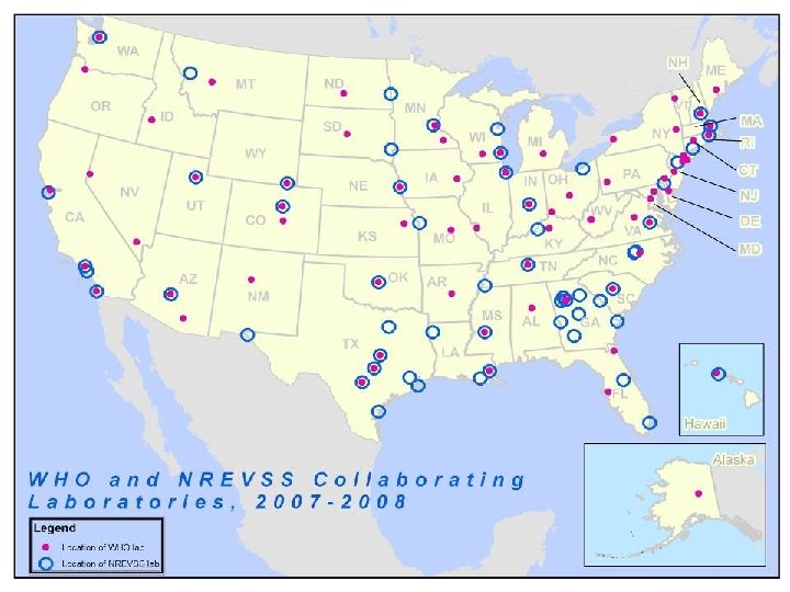 U. S. Virologic Surveillance: Participating Labs • WHO Collaborating Labs – ~ 85 labs – Maintained by ID/CDC – State health dept. , universities, large tertiary care hospital labs, and Do. D – Subtype influenza A – Report age data – Send subset of isolates to CDC for further testing • NREVSS labs – ~ 65 labs – Maintained by DVD/CDC – Hospital labs – Report data on other respiratory viruses – Less likely to subtype influenza A viruses – Don’t report age data – Data incorporated into flu surveillance since 97 -98