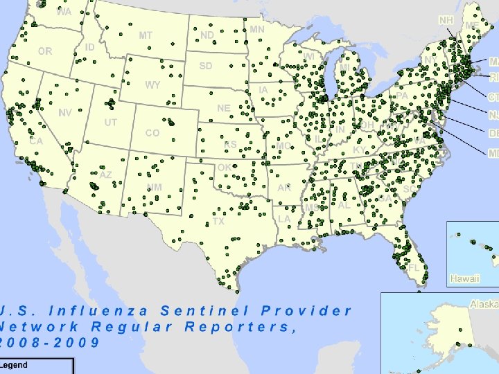 Outpatient Influenza Surveillance (ILINet) • ~2, 400 healthcare providers in 50 states • Weekly reports – Total # of patient visits – # visits for influenza-like illness (ILI) by age group • ILI = fever 100 ºF (37. 8 ºC) and cough or sore throat, in absence of a known cause other than influenza • Early, peak, and late season
