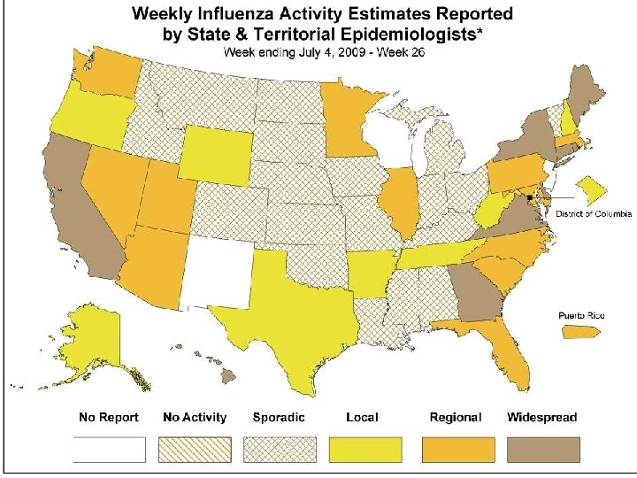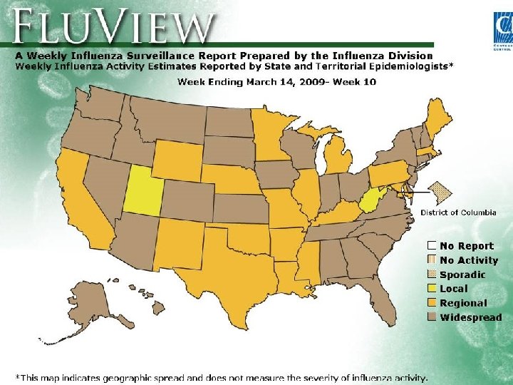 Geographic Spread of Influenza • Weekly reports from State and territorial epidemiologists • Assessment of overall influenza activity at state level – None, sporadic, local, regional, or widespread – Incorporates virologic and ILI data – Only system reporting state-level data • Allows local interpretation of surveillance data
