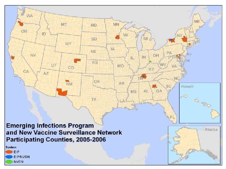 Hospitalization Surveillance • Population-based surveillance for laboratory confirmed influenza related hospitalizations • Emerging Infections Program – All ages – Lab tests as part of routine patient care – Chart reviews • New Vaccine Surveillance Network – 0 – 4 year olds – Children admitted with fever or acute respiratory illness are swabbed and tested – Culture and PCR – Chart reviews
