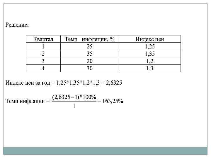 ЗАДАЧА № 2. Определите темп инфляции за год, если известны показатели роста цен по кварталам: за первый квартал цены выросли на 25%; за 2 ой – на 35%; за 3 -ий – на 20%; за 4 -ый – на 30%.