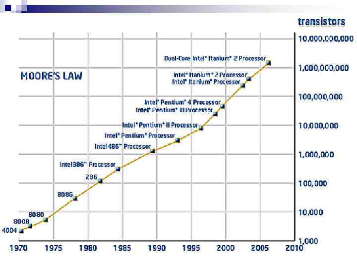 n Суть досліджень Гордона Мура: n Г. Мур відмітив, що: приблизно кожні 1, 5 року відстані між елементами на одному кристалі скорочуються приблизно на 30%. Отже, кількість елементів на такому кристалі подвоюється. Ø Ø Збільшення кількості елементів на одному кристалі супроводжується зростанням його продуктивності, яка визначається тактовою частотою. Ø Випуск нової моделі мікропроцесора відбувається в середньому кожні 3 -5 років, а його продуктивність зростає в 2 -4 рази.