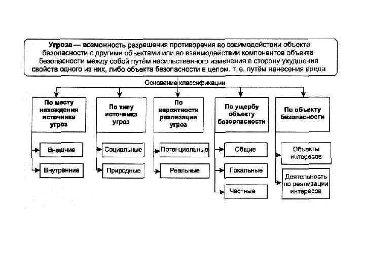 Классификация Потенциальная угроза - представляет угрозу общего характера, не связанную с пространством и временем. (Например: вся деятельность человека потенциально опасна) Условия реализации потенциальной угрозы называют причинами. Они характеризуют совокупность обстоятельств, в результате которых появляются и возникают те или иные нежелательные последствия, убытки (ущербы). (Например: травматизм разной тяжести) Реальная угроза всегда связана с конкретной угрозой воздействия на объект, она координирована в пространстве и во времени. Например, движущаяся по шоссе цистерна с надписью «огнеопасно» представляет собой реальную угрозу для человека, находящегося около автодороги. Как только цистерна ушла из зоны пребывания человека, она превратилась в источник потенциальной угрозы к этому человеку.