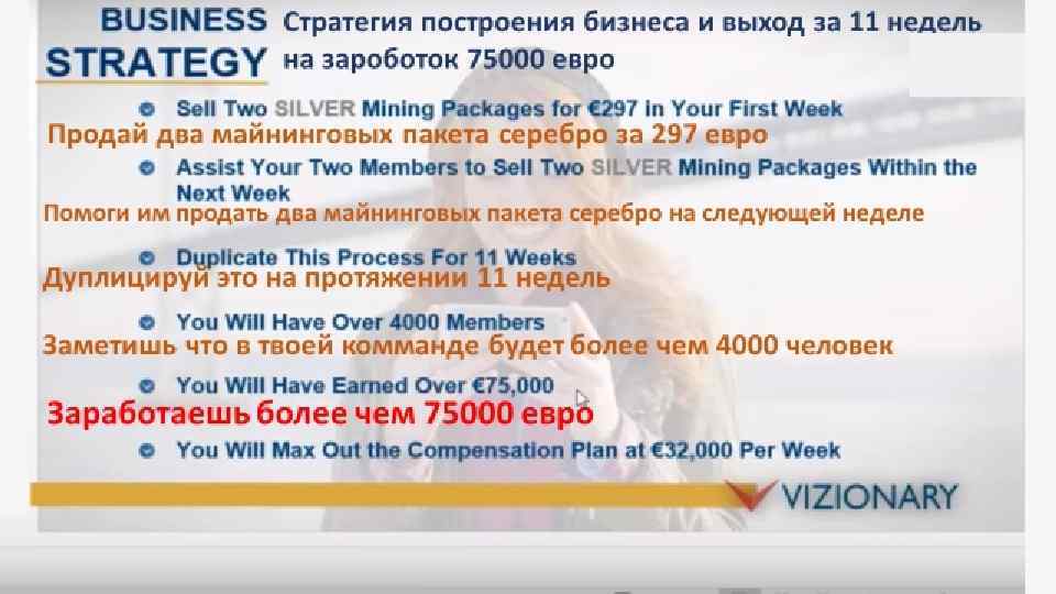 Компенсационный План Vizionary Для тех, кто хочет создавать вместе с нами свою бизнес сеть, у Vizionary есть простой и понятный компенсационный план. Он состоит из комиссии от прямых продаж, бонус за развитие 2 команд (STEP) + бонус соответствия от 5 – 15% с 5 уровней, и бонус за развитие структуры другими партнерами. Стартовый Бонус Пакет Бронзовый пакет Серебрянный пакет Золотой пакет Платиновый пакет Пакет Vizionary Цена Слоты (Первая нед. ) Дополн. юниты или слоты майнинг лим. /неделя € 97 1 слот 100 юнитов = 2 дополн. Слотов 2 слота € 297 4 слота 600 юнитов = 12 дополн. слотов 8 слотов € 897 12 слотов 2, 200 юнитов = 44 дополн. слотов 24 слота € 1, 997 30 слотов 6, 000 юнитов = 120 дополн. слотов 80 слотов € 5, 997 100 слотов 20, 000 юнитов = 400 дополн. слотов 100 слотов CV Бонус прямых продаж/первые 30 дней 50 € 10. 00 200 € 30. 00 600 € 90. 00 180. 00 1500 € 200. 00 400. 00 5000 € 600. 00 1200. 00 Вы зарабатываете 5 CV за каждый слот, приобретенный в нижестоящими партнерами с неограниченной глубины Вашей командной сети - За каждый 1 шаг (Step) равен 500 CV в каждой ветке , и начисляется Вам от 50 до 80 Eur。 - Для накопления и зарабатывания CV пунктов не требуется лично приобретать слоты. Вы также зарабатываете CV за каждый слот, который был куплен в Вашей бинарной системе. Когда Вы достигаете 5 шагов(Step) Vizionary выплачивает Вам бонус в размере 100 Евро (без ограничения во времени). Когда Вы достигаете 20 шагов(Step) Vizionary выплачивает Вам бонус в размере 250 Евро (без ограничения во времени). * Через 30 дней Vizionary проверит Ваш стартовый бонус. Если Вам за это время удалось достигнуть от 5 до 19 шагов, Ваш спонсорский бонус за все проданные за это время пакеты увеличится на 50%. От 20 и больше шагов бонус по прямым продажам увеличится задним числом на 100%