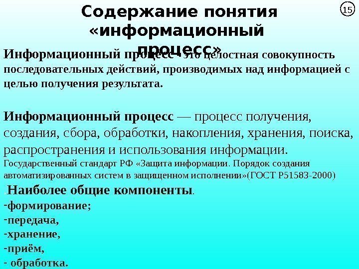 Информационный процесс — это целостная совокупность последовательных действий, производимых над информацией с целью получения результата. Информационный процесс — процесс получения, создания, сбора, обработки, накопления, хранения, поиска, распространения и использования информации. Государственный стандарт РФ «Защита информации. Порядок создания автоматизированных систем в защищенном исполнении» (ГОСТ Р 51583 -2000) . Наиболее общие компоненты. — формирование; — передача, — хранение, — приём, — обработка. СОДЕРЖАНИЕ ПОНЯИСодержание понятия «информационный процесс»