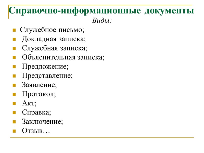 Справочно-информационные документы Виды: Служебное письмо; Докладная записка; Служебная записка; Объяснительная записка; Предложение; Представление; Заявление; Протокол; Акт; Справка; Заключение; Отзыв…