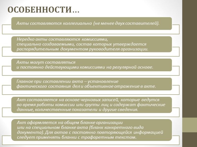 Акт – документ, составленный несколькими лицами и подтверждающий установленные факты или события. В некоторых случаях акты не только фиксируют установленные факты и события, но и содержат выводы, рекомендации и предложения (акты проверок, обследований, ревизий и т.п.).