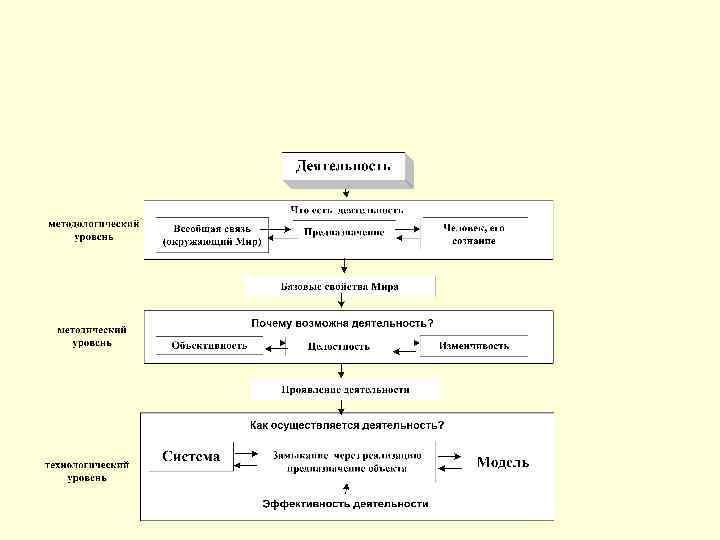 Структурная схема развёртывания содержания понятия «Познание» Система Методологический уровень (1) Субъект ПОЗНАНИЕ 10 Модель Что осуществляется? Отражение действительности Деятельность Базовые свойства Мира Почему возможно познание? Методический уровень(2) Объективность Целостность Изменчивость Моделирование (Приближённое описание) Как осуществляется познание? Технологический уровень(3) Модель объекта Замыкание моделей через предназначение Модель действие объекта Заданная степень реализации возможностей объекта В процессе познания действительность предъявляет требования к разработчику, создателю какого-то объекта, необходимые для решения актуальной задачи. Разработчик ставит цель на разработку, степень достижения которой определяется эффективностью применения системы. Мерой соответствия системы своему предназначению является показатель эффективности применения разрабатываемой системы. Как раз условие замыкания «модели объекта» и «модели действия» этого объекта через предназначение определяет критерий правильно построенной системы. (Критерий целостности системы).