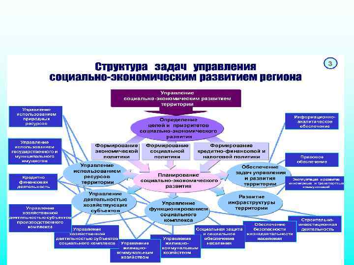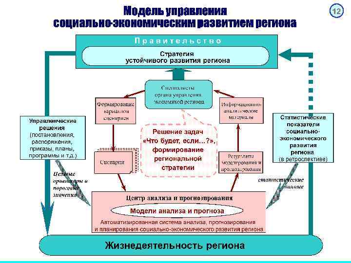 Информационно-аналитическое обеспечение задач стратегического планирования развития региона Глобальная цель управления регионом повышение уровня и улучшение условий жизни населения, которая включает, в первую очередь, решение задач обеспечения социальных норм и стандартов жизнедеятельности населения и комплексного социально экономического развития территории. Условием обеспечения устойчивого развития отлаженный механизм уверенного управления всеми сферами жизнедеятельности региона. Тезис о полном саморегулировании в условиях рыночной экономики канул в прошлое. Поступательное движение как в экономике, так и в социальной сфере, немыслимо без правового, экономического и административного регулирования социально экономические процессы. Управление территорией сводится к решению нескольких относительно самостоятельных, но взаимосвязанных задач: определение целей и приоритетов развития территории; планирование социально экономического развития; управление социальной сферой жизнедеятельности населения; управление (регулирование) деятельностью хозяйствующих субъектов территории; управление использованием ресурсов территории; обеспечение задач управления и развития.