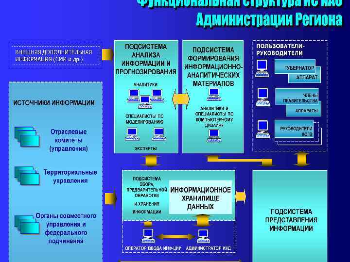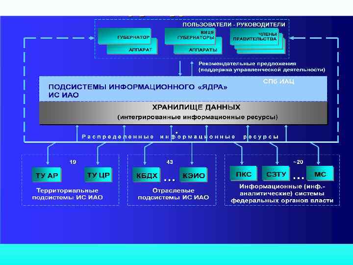 Информационные системы информационно-аналитической деятельности в контуре управления регионом Территориальные подсистемы создаются в составе реализуемых типовых автоматизированных информационных системах территориальных управлений административных районов города (АИС ТО). По числу районов таких систем 19. Отраслевые подсистемы представляют собой информационные (информационно аналитические) системы отраслевых комитетов и управлений. Всего планируется функционирование более 40 ведомственных систем различного масштаба. Системы федеральных структур власти. Реализуется тесное взаимодействие с территориальными органами федеральных структур власти и органов власти совместного подчинения с регионом. Разработка и ввод в эксплуатацию технологического «ядра» ИС ИАО, выполняющей свои функции на городском, межведомственном уровне в интересах прежде всего губернатора региона и членов Правительства региона, осуществляется путем последовательного охвата различных сфер жизнедеятельности региона: 1 ый этап – социально экономическая сфера; 2 ой этап социально демографическая; 3 ий этап производственно экономическая сферы; 4 ый этап – социально политическая и финансово кредитная сферы; 5 ый этап среда обитания и сфера безопасности региона.