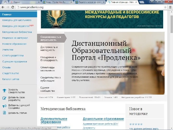 ФЕДЕРАЛЬНЫЕ ОБРАЗОВАТЕЛЬНЫЕ ПОРТАЛЫ ØФедеральный портал "Российское образование" http: //www. edu. ru Ø «Открытый класс» (http: //www. openclass. ru) или «Сеть творческих учителей» (http: //it-n. ru) ØЦентр дистанционного образования «Эйдос» (http: //www. eidos. ru) Ø Издательский дом « 1 Сентября» (http: //1 september. ru) ØФедеральный образовательный портал «Информационно-коммуникационные технологии в образовании» http: //www. ict. edu. ru