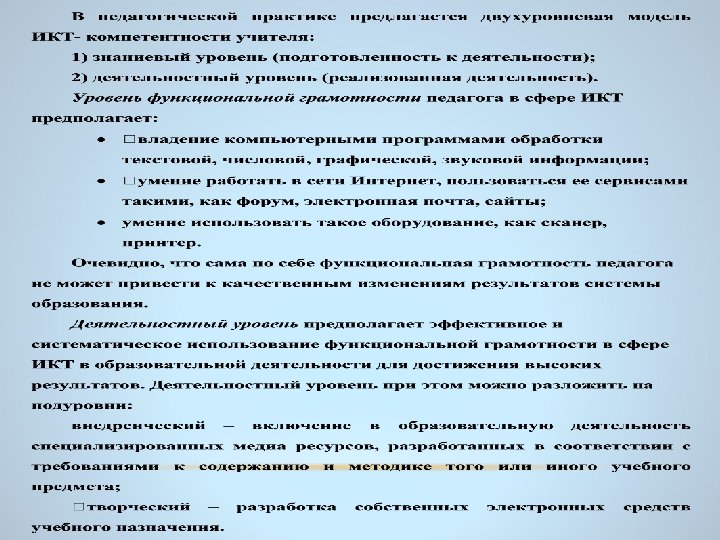 Федеральные государственные образовательные стандарты второго поколения «Информационные технологии… должны пронизывать весь образовательный процесс. В этих условиях минимально необходимые требования к подготовке учителя – это владение навыками использования ИКТ. Современный учитель должен уметь работать с общепользовательскими инструментами: текстовым редактором, редактором презентаций и т. д. , пользоваться мультимедийными информационными источниками и инструментами коммуникации, в первую очередь, электронной почтой; использовать системы управления учебной деятельностью, применять иные современные ИКТ-средства. »