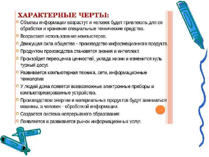 Черты информационного общества : решена проблема информационного кризиса; : обеспечен приоритет информации по сравнению с другими ресурсами; : главной формой развития является информационная экономика; : информационная технология приобретает глобальный характер, охватывая все сферы социальной деятельности человека; : формируется информационное единство всей человеческой цивилизации; : с помощью средств информатики реализован свободный доступ каждого человека к мировым информационным ресурсам.