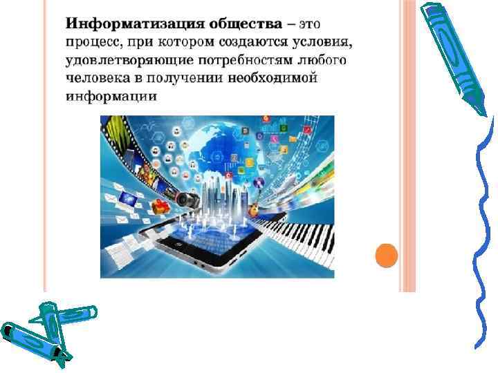 Информатизация общества Переход к информационному обществу происходит через процесс информатизации всех сторон общественной и личной жизни населения страны. Цель всякого научноинформационного прогресса состоит в улучшении жизни людей. Информатизация - развитие и распространение информационных средств и технологий с целью достижения уровня информированности населения, который приведет к кардинальному улучшению условий труда и жизни каждого человека