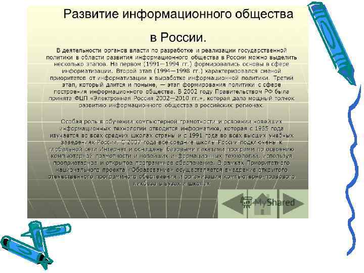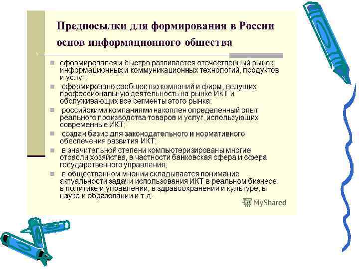 Признаки информационного общества • • • Осознание обществом приоритетности информации перед другим продуктом деятельности человека. Первоосновой всех направлений деятельности человека (экономической, производственной, политической, образовательной, научной, творческой, культурной и т. п. ) является информация. Информация же является продуктом деятельности современного человека. Информация в чистом виде (сама по себе) является предметом купли – продажи. Равные возможности в доступе к информации всех слоев населения. Безопасность информационного общества, информации. Защита интеллектуальной собственности. Взаимодействие всех структур государства и государств между собой на основе ИКТ. Управление информационным обществом со стороны государства, общественных организаций.