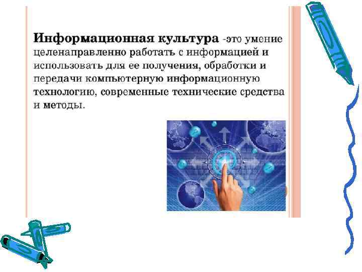 Проявление информационной культуры • • • в конкретных навыках по использованию технических устройств; в способности использовать в своей деятельности компьютерную информационную технологию; в умении извлекать информацию из различных источников: как из периодической печати, так и из электронных коммуникаций, представлять ее в понятном виде и уметь ее эффективно использовать; во владении основами аналитической переработки информации; в умении работать с различной информацией; в знании особенностей информационных потоков в своей области деятельности.