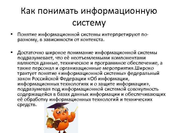 Как понимать информационную систему • Понятие информационной системы интерпретируют поразному, в зависимости от контекста. • Достаточно широкое понимание информационной системы подразумевает, что её неотъемлемыми компонентами являются данные, техническое и программное обеспечение, а также персонал и организационные мероприятия. Широко трактует понятие «информационной системы» федеральный закон Российской Федерации «Об информации, информационных технологиях и о защите информации» , подразумевая под информационной системой совокупность содержащейся в базах данных информации и обеспечивающих её обработку информационных технологий и технических средств.