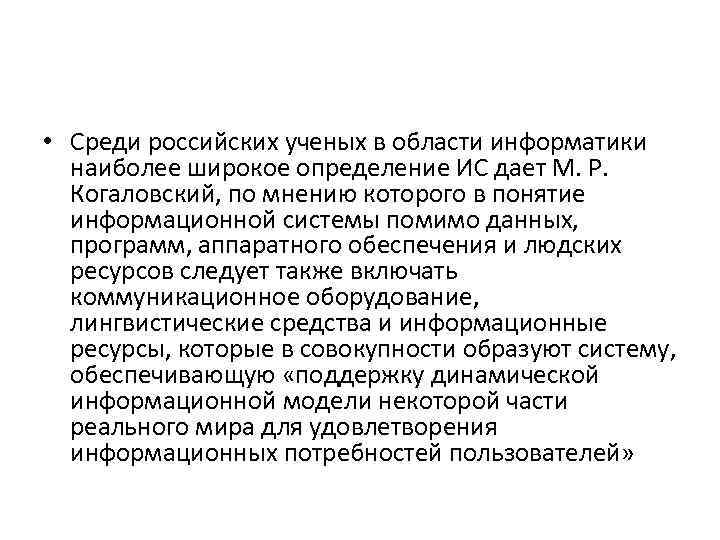• Среди российских ученых в области информатики наиболее широкое определение ИС дает М. Р. Когаловский, по мнению которого в понятие информационной системы помимо данных, программ, аппаратного обеспечения и людских ресурсов следует также включать коммуникационное оборудование, лингвистические средства и информационные ресурсы, которые в совокупности образуют систему, обеспечивающую «поддержку динамической информационной модели некоторой части реального мира для удовлетворения информационных потребностей пользователей»