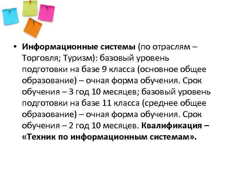 • Информационные системы (по отраслям – Торговля; Туризм): базовый уровень подготовки на базе 9 класса (основное общее образование) – очная форма обучения. Срок обучения – 3 год 10 месяцев; базовый уровень подготовки на базе 11 класса (среднее общее образование) – очная форма обучения. Срок обучения – 2 год 10 месяцев. Квалификация – «Техник по информационным системам» .