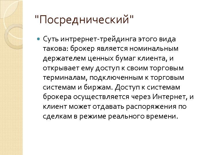 "Посреднический" Суть интрернет-трейдинга этого вида такова: брокер является номинальным держателем ценных бумаг клиента, и открывает ему доступ к своим торговым терминалам, подключенным к торговым системам и биржам. Доступ к системам брокера осуществляется через Интернет, и клиент может отдавать распоряжения по сделкам в режиме реального времени.