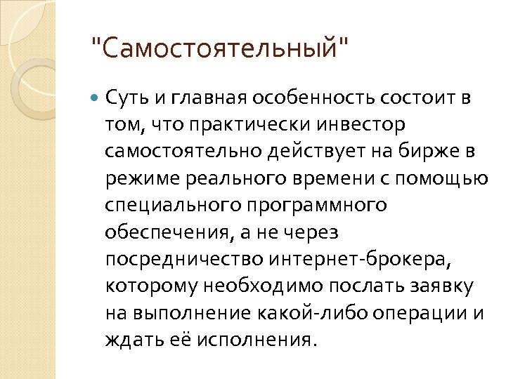 "Самостоятельный" Суть и главная особенность состоит в том, что практически инвестор самостоятельно действует на бирже в режиме реального времени с помощью специального программного обеспечения, а не через посредничество интернет-брокера, которому необходимо послать заявку на выполнение какой-либо операции и ждать её исполнения.