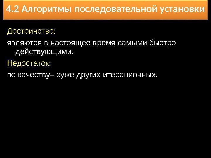 4. 2 Алгоритмы последовательной установки Достоинство: являются в настоящее время самыми быстро действующими. Недостаток: по качеству– хуже других итерационных.