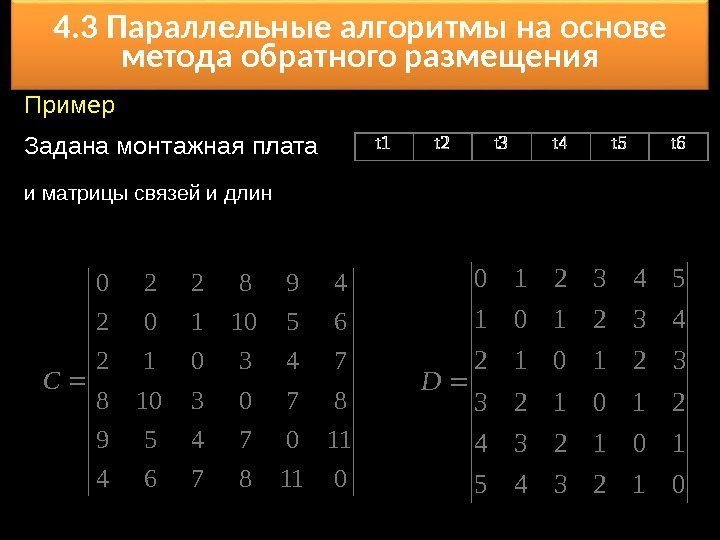 4. 3 Параллельные алгоритмы на основе метода обратного размещения Суть: выполняется предварительная оценка каждого размещенного элемента x i и каждого места печатной платы t i. После этого элементы размещаются одновременно. Пусть заданы матрица связей С и длин D : nn ij c. C mm ij d. D nm