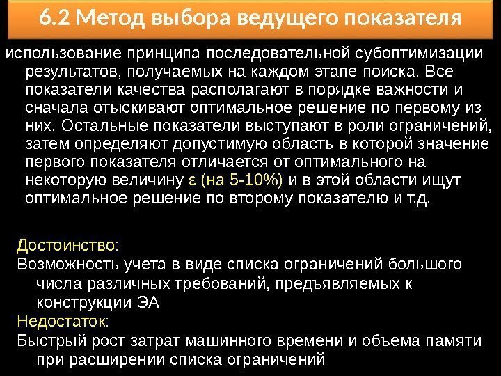 6. 2 Метод выбора ведущего показателя использование принципа последовательной субоптимизации результатов, получаемых на каждом этапе поиска. Все показатели качества располагают в порядке важности и сначала отыскивают оптимальное решение по первому из них. Остальные показатели выступают в роли ограничений, затем определяют допустимую область в которой значение первого показателя отличается от оптимального на некоторую величину ε (на 5 -10%) и в этой области ищут оптимальное решение по второму показателю и т. д. Достоинство: Возможность учета в виде списка ограничений большого числа различных требований, предъявляемых к конструкции ЭА Недостаток: Быстрый рост затрат машинного времени и объема памяти при расширении списка ограничений