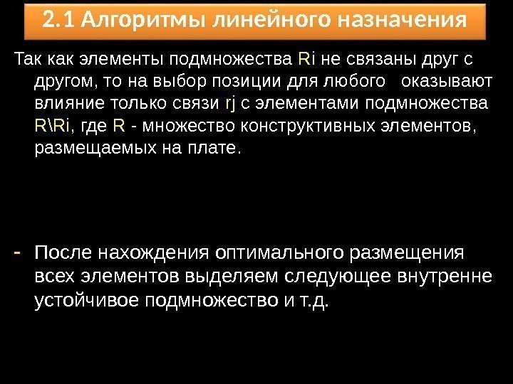 Так как элементы подмножества Ri не связаны друг с другом, то на выбор позиции для любого оказывают влияние только связи rj с элементами подмножества R\Ri , где R — множество конструктивных элементов, размещаемых на плате. 2. 1 Алгоритмы линейного назначения — После нахождения оптимального размещения всех элементов выделяем следующее внутренне устойчивое подмножество и т. д.
