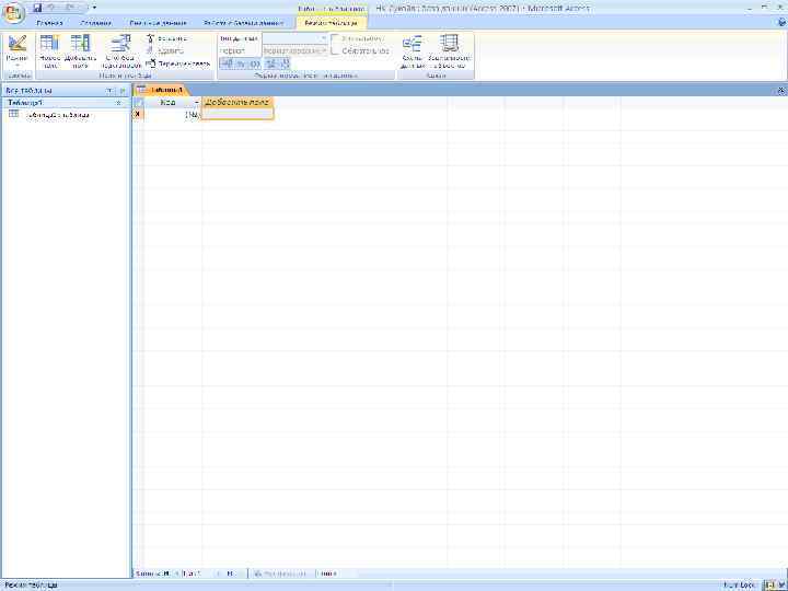 Создание таблиц Нажмите кнопку Создать, приложение Access создаст новую базу данных и откроет ее в режиме таблицы.