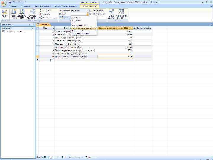 Работа с СУБД начинается с создания структуры базы данных, т. е. с определения: • количества столбцов; • названий столбцов; • типов столбцов (текст/число/дата); • ширины столбцов.