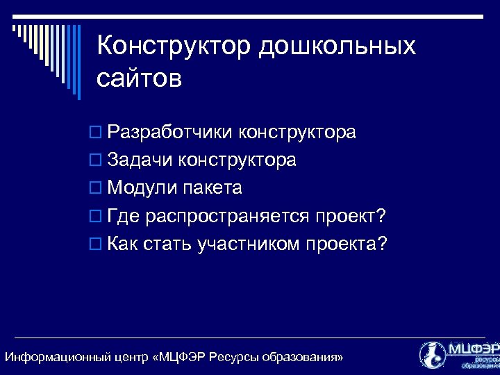 Конструктор дошкольных сайтов o Разработчики конструктора o Задачи конструктора o Модули пакета o Где распространяется проект? o Как стать участником проекта? Информационный центр «МЦФЭР Ресурсы образования»