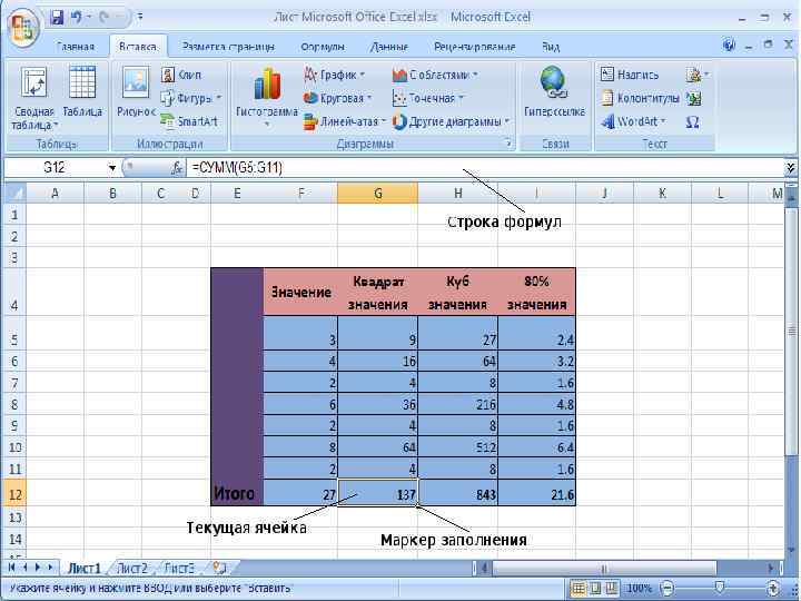 Основные понятия электронных таблиц Обозначение ячейки состоит из номера столбца и строки, на пересечении которых она расположена, например: А 1, G 22. Номер ячейки выполняет функции ее адреса и используется при записи формул. Данные, расположенные в соседних ячейках, можно рассматривать как единое целое. Такую группу ячеек называют диапазоном. Диапазон ячеек обозначают, указывая через двоеточие номера ячеек, расположенных в противоположных углах прямоугольника, например: А 1: С 15.