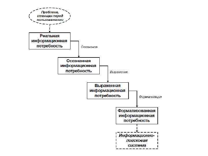 Этапы представления ИП: • реальная ИП –потребность в некоторой новой информации при решении стоящей перед пользователем задачи; • выраженная ИП – результат описания осознанной информационной потребности с помощью естественного языка; • формализованная ИП – это результат представления выраженной потребности средствами формального поискового языка ИПС.