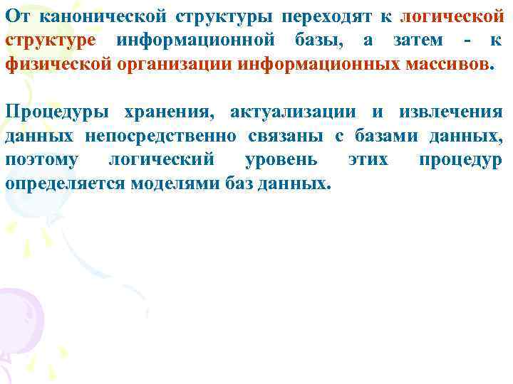 От канонической структуры переходят к логической структуре информационной базы, а затем - к физической организации информационных массивов. Процедуры хранения, актуализации и извлечения данных непосредственно связаны с базами данных, поэтому логический уровень этих процедур определяется моделями баз данных.