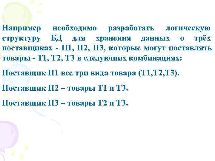 Например необходимо разработать логическую структуру БД для хранения данных о трёх поставщиках - П 1, П 2, П 3, которые могут поставлять товары - Т 1, Т 2, Т 3 в следующих комбинациях: Поставщик П 1 все три вида товара (Т 1, Т 2, Т 3). Поставщик П 2 – товары Т 1 и Т 3. Поставщик П 3 – товары Т 2 и Т 3.