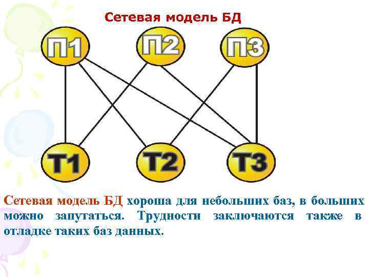 Сетевая модель БД хороша для небольших баз, в больших можно запутаться. Трудности заключаются также в отладке таких баз данных.