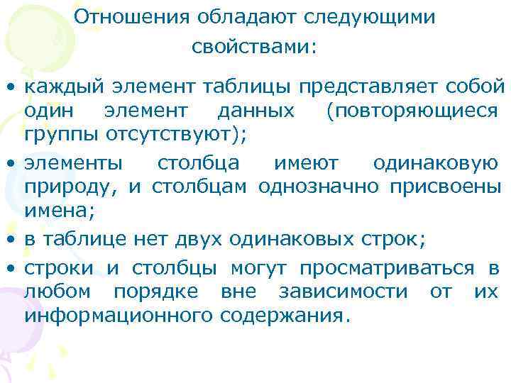 Отношения обладают следующими свойствами: • каждый элемент таблицы представляет собой один элемент данных (повторяющиеся группы отсутствуют); • элементы столбца имеют одинаковую природу, и столбцам однозначно присвоены имена; • в таблице нет двух одинаковых строк; • строки и столбцы могут просматриваться в любом порядке вне зависимости от их информационного содержания.