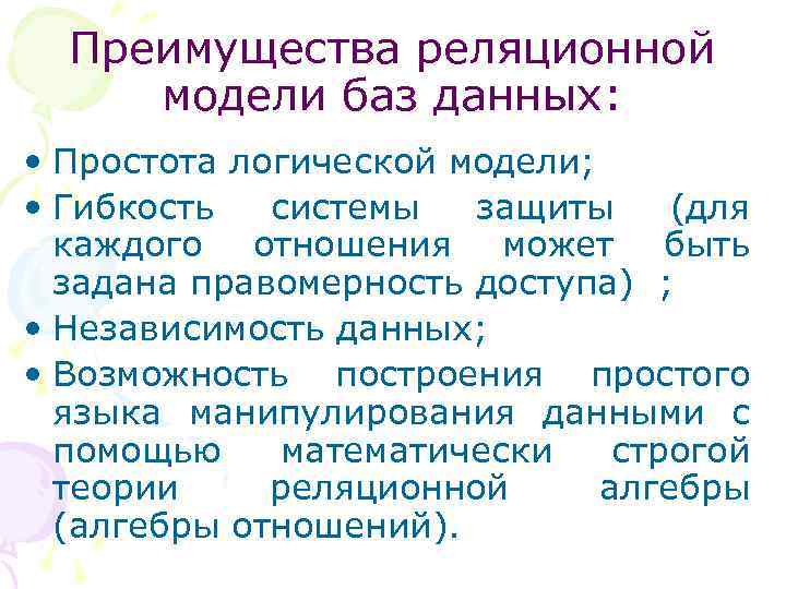 Преимущества реляционной модели баз данных: • Простота логической модели; • Гибкость системы защиты (для каждого отношения может быть задана правомерность доступа) ; • Независимость данных; • Возможность построения простого языка манипулирования данными с помощью математически строгой теории реляционной алгебры (алгебры отношений).