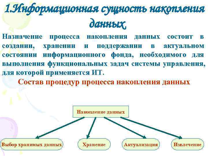 1. Информационная сущность накопления данных. Назначение процесса накопления данных состоит в создании, хранении и поддержании в актуальном состоянии информационного фонда, необходимого для выполнения функциональных задач системы управления, для которой применяется ИТ. Состав процедур процесса накопления данных Накопление данных Выбор хранимых данных Хранение Актуализация Извлечение