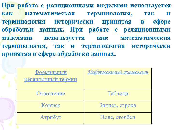 При работе с реляционными моделями используется как математическая терминология, так и терминология исторически принятая в сфере обработки данных. При работе с реляционными моделями используется как математическая терминология, так и терминология исторически принятая в сфере обработки данных. Формальный Неформальный эквивалент реляционный термин Отношение Таблица Кортеж Запись, строка Атрибут Поле, столбец