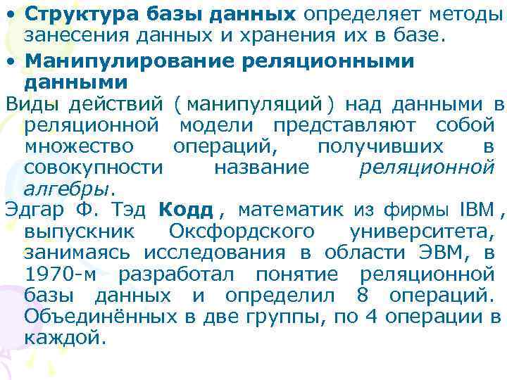 • Структура базы данных определяет методы занесения данных и хранения их в базе. • Манипулирование реляционными данными Виды действий ( манипуляций ) над данными в реляционной модели представляют собой множество операций, получивших в совокупности название реляционной алгебры. Эдгар Ф. Тэд Кодд , математик из фирмы IBM , выпускник Оксфордского университета, занимаясь исследования в области ЭВМ, в 1970 -м разработал понятие реляционной базы данных и определил 8 операций. Объединённых в две группы, по 4 операции в каждой.