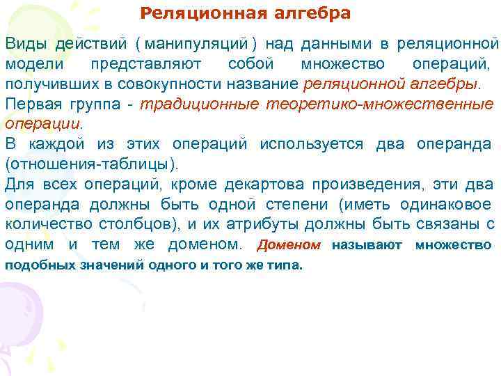 Реляционная алгебра Виды действий ( манипуляций ) над данными в реляционной модели представляют собой множество операций, получивших в совокупности название реляционной алгебры. Первая группа - традиционные теоретико-множественные операции. В каждой из этих операций используется два операнда (отношения-таблицы). Для всех операций, кроме декартова произведения, эти два операнда должны быть одной степени (иметь одинаковое количество столбцов), и их атрибуты должны быть связаны с одним и тем же доменом. Доменом называют множество подобных значений одного и того же типа.